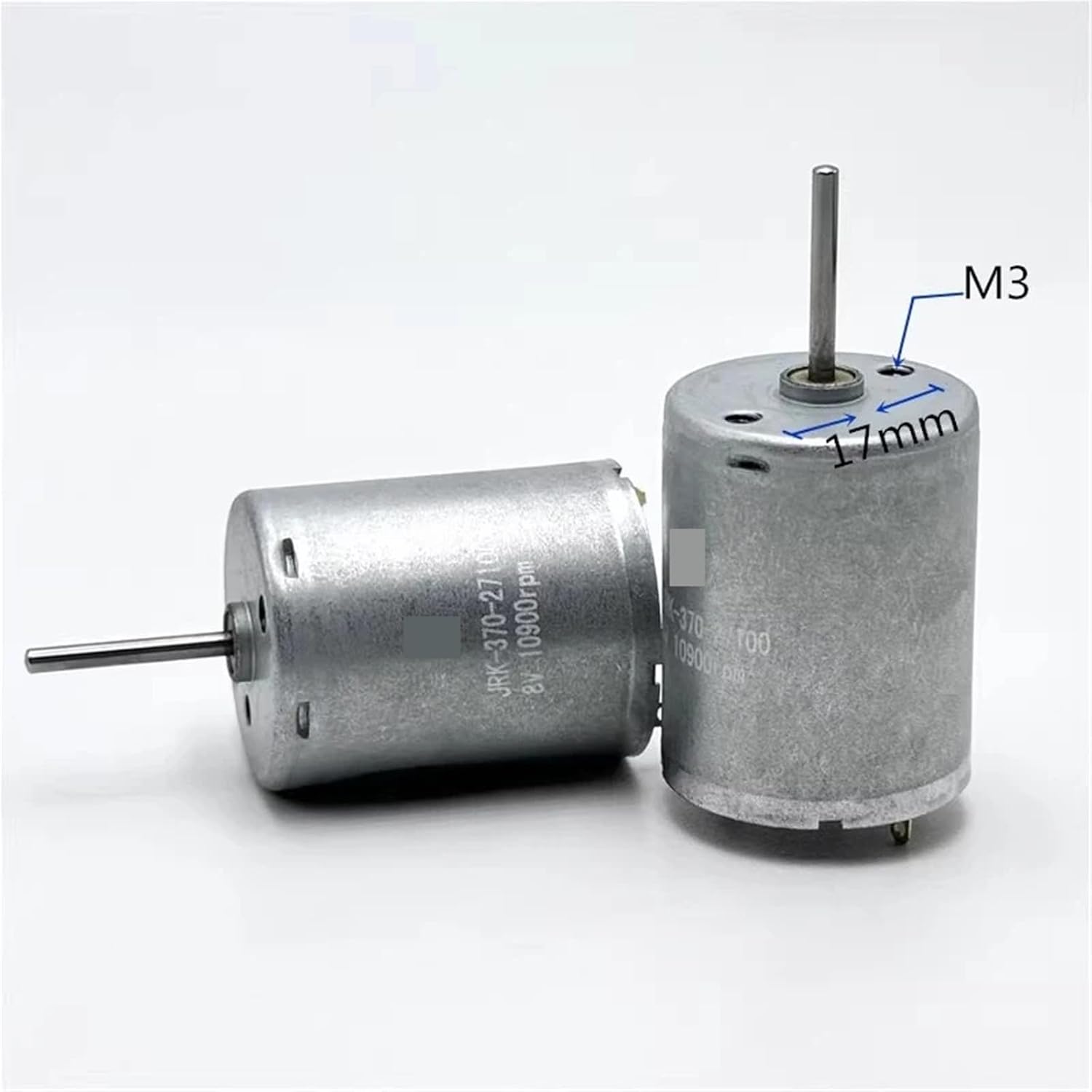 MotorsSpecification:2.Model: RK-370-271003.Motor size: 24.3mm*30.8mm4.Output shaft diameter: 2.0mm5.Output shaft length: 17.5mm6.Weight: 50g7.Suitable voltage: 3.0V-8.0V8.Test data:Voltage:3.0V No-load speed:4000RPM Current:80mAVoltage:3.7V No-load speed:5000RPM Current:85mAVoltage:5.0V No-load speed:6800RPM Current:93mAVoltage:6.0V No-load speed:8000RPM Current:100mAVoltage:8.0V No-load speed:10900RPM Current:115mA=========================Package List:Motor x 1PC==========Hign-concerned Chemical : NoneModel Number : Mini 370 MotorConstruction : Permanent MagnetType : Micro MotorProtect Feature : Explosion-proofCommutation : BrushEfficiency : IE 1Use : Home ApplianceModel number : RK-370-27100Motor size : 24.3mm*30.8mmOutput shaft diameter : 2.0mmSuitable voltage : 3.0V-8.0VSpeed range : 4000RPM-10900RPM