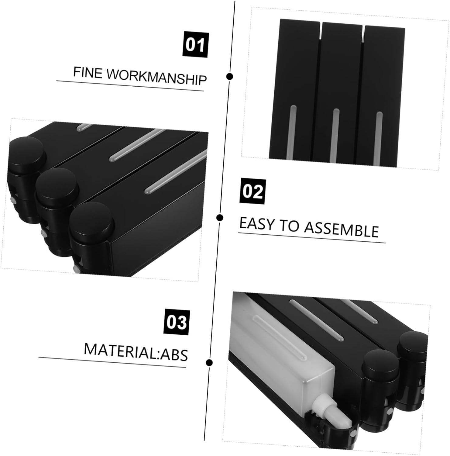 Package List 1 x shower dispenser Features -Size:28.00X15.00X8.00cm/11.00X5.89X3.14in Shampoo Dispenser For Shower Wall -Color:Black Shampoo And Conditioner Dispenser -Material:ABS,PVC Body Wash Dispenser - The shower dispenser is refillable. Open the panel and you will see a bottle. All you need to do is fill the bottle with the products and put it back Shampoo Holder. - Crafted with , the shampoo dispenser ensures durability and resistance to damage Bathroom Shampoo Dispenser. - Adopting a space-saving design, the shower dispenser will help you better organize your bathroom essentials Wall Mounted Shower Pump Dispenser. - The button is easy to use, not easily get jammed. Simply press will get the amount of body wash you need Shampoo Bottles. - The convenient three-chamber design allows for easy dispensing of three different products at the same time Shower Soap Dispenser.Goods InformationBathroom Shower Dispensers The button is easy to use, making shampoo or other refills smoothly run out.Shampoo Conditioner Dispenser Made of plastic material, it is built to last.Shower Soap Dispenser With this dispenser, your bathroom will look tidy and organized.Shower Gel Container The outlet is designed to prevent any leakage.Shower Shampoo Dispenser 3 Chamber The shower dispenser offers a for better bathroom organization