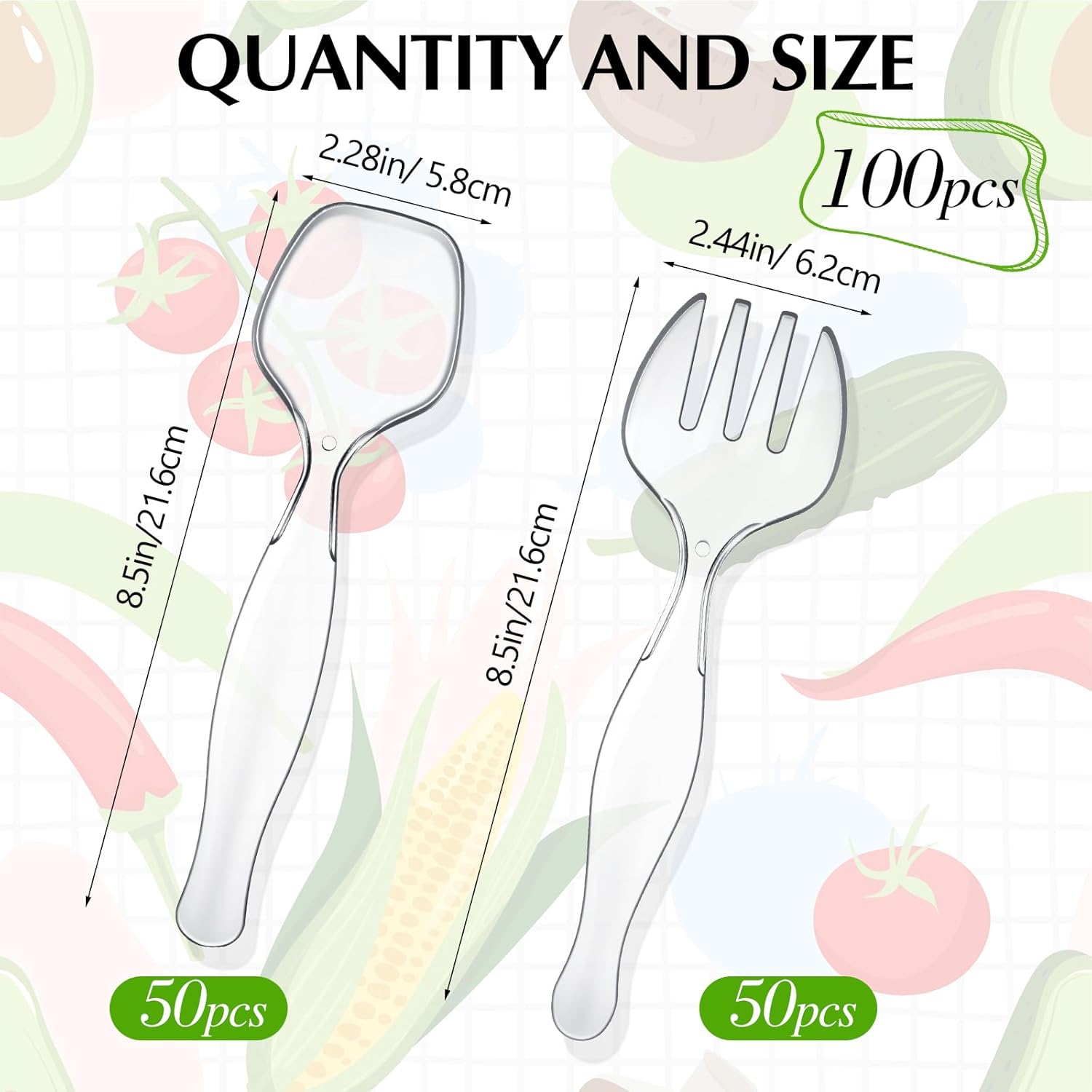 Features: Thick plastic stays sturdy. The 8.5-inch large size eases serving, and you can reuse it or dispose of it for hassle-free cleanup. This 100-piece clear utensil set works for steamy soups, fresh salads, and more Add a polished touch to any gathering (weddings, birthdays, barbecues) with these sleek clear utensils. Specifications: Material: plastic Color: clear Size: Forks: 8.5 x 2.28 inches/ 21.6 x 5.8 cm Spoons: 8.5 x 2.44 inches/ 21.6 x 6.2 cm Package includes: 50 x Forks 50 x Spoons Notes: Manual measurement, please allow slight errors on size. The color may exist a slight difference due to different screen displays
